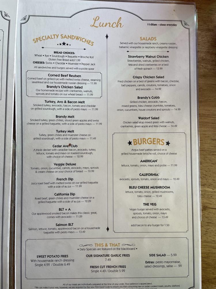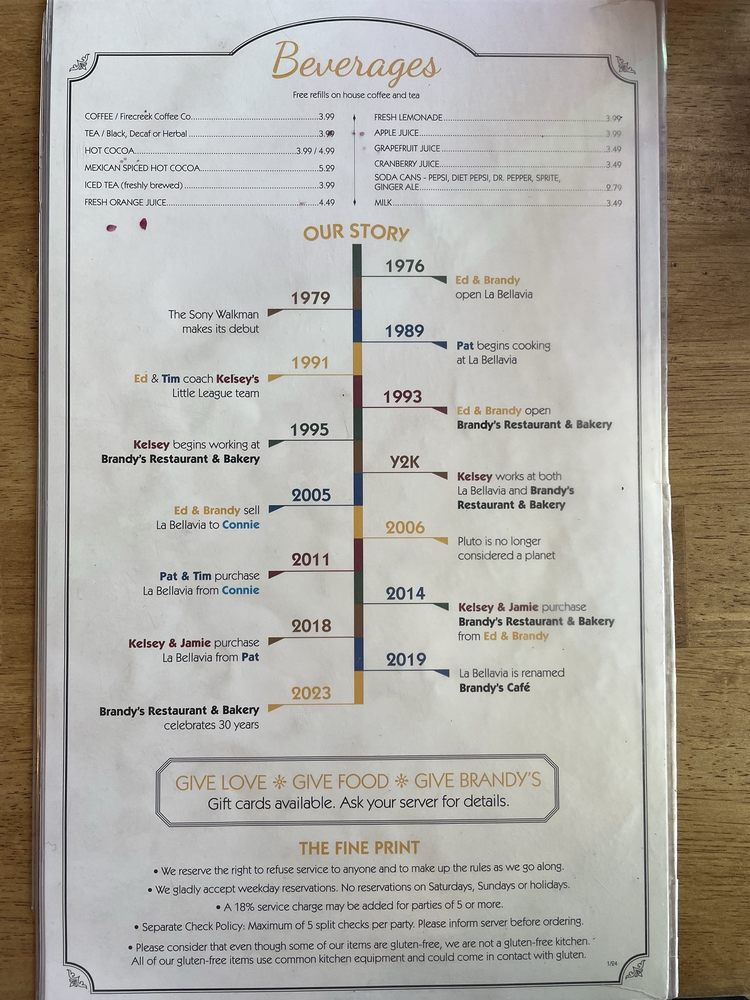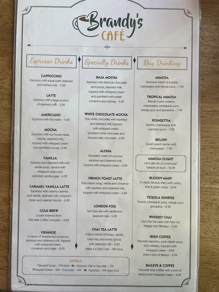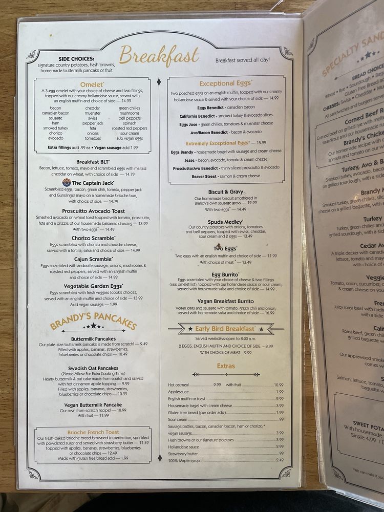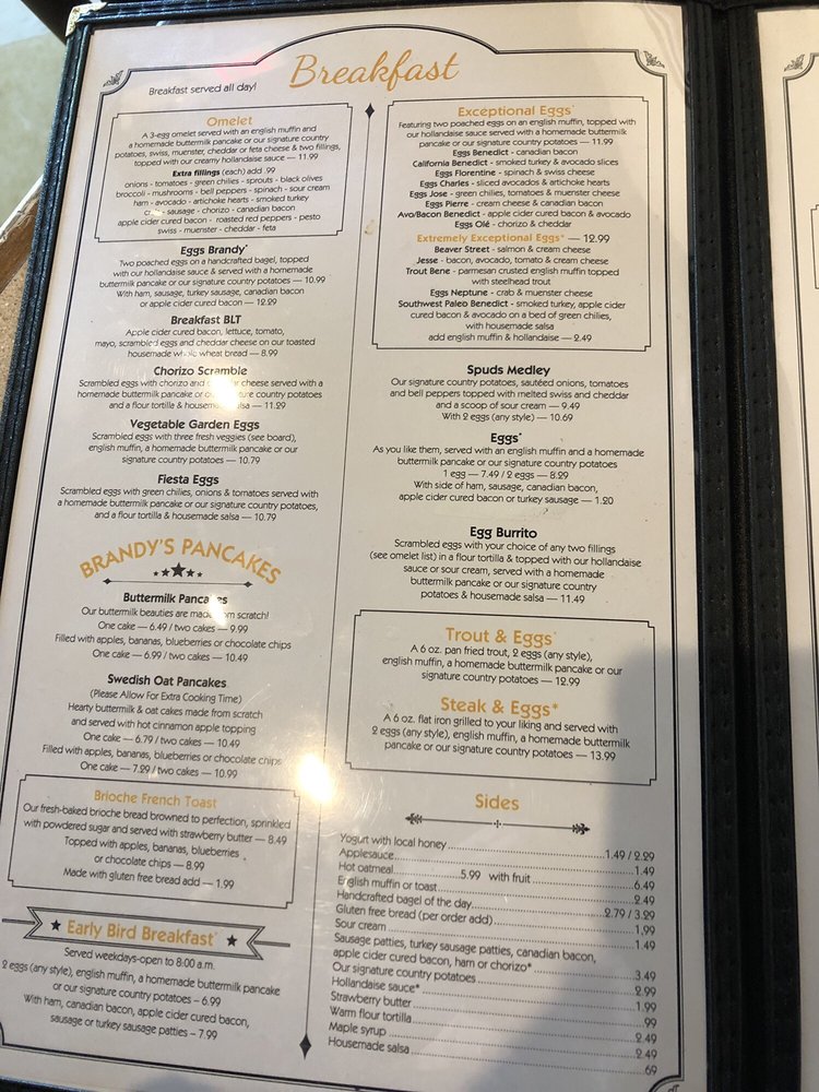 Brandy's Cafe, located in Flagstaff, AZ, is a beloved American breakfast and brunch spot with a casual, woodsy feel. Offering a menu full of delicious options like the savory pumpkin pancake and the Southside Chicken Salad, Brandy's Cafe is a must-visit for locals and visitors alike. Customers rave about the excellent service provided by servers like Ben, who go above and beyond to ensure a positive dining experience. With vegan and vegetarian options available, as well as a dog-friendly patio, Brandy's Cafe caters to a diverse range of customers. Don't miss out on their homemade pastries and their famous strawberry butter - a true indulgence for the taste buds. Whether you're craving a hearty breakfast burrito or a light and fresh salad, Brandy's Cafe has something to satisfy every craving.